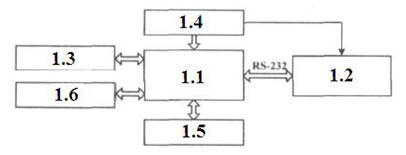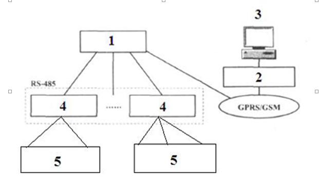 附圖中標(biāo)記的說明如下:1-數(shù)據(jù)采集控制終端、2-GSM/GPRS數(shù)據(jù)傳輸單元、3-遠(yuǎn)程監(jiān)控中心、4-電梯控制器、5-煙霧探測器、 1.1-單片機(jī)、1.2-GPRS無線通信裝置、1.3-定時(shí)復(fù)位系統(tǒng)、1.4-電源系統(tǒng)、1.5-RS-485接口、1.6-噴淋控制裝置。